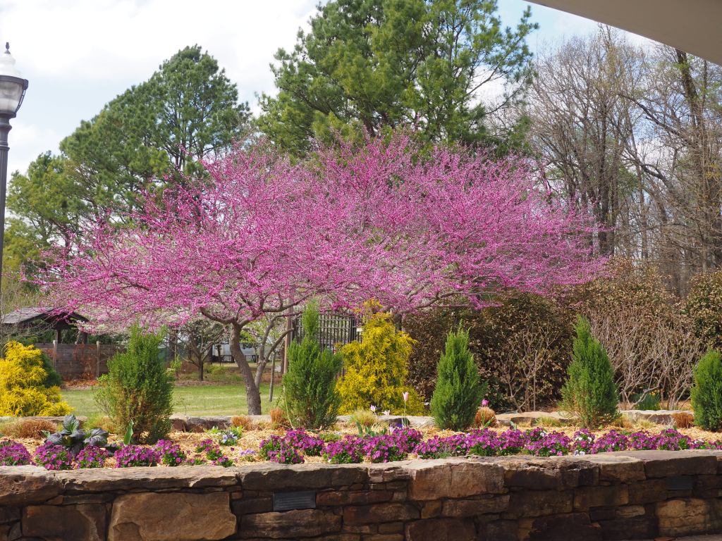 Our first stop is Fayetteville at the Botanical Gardens of the Ozarks. At about forty acres the stroll begins through the large iron gate to the cement path that circumvents a large grassy mall. We chose to follow the path counter-clockwise past the small creek. The redbuds bloomed in their gorgeous pink with various greenery at the bases. The circular cement walkway features several side paths leading to twelve themed mini-gardens.